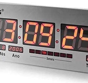 O Relógio digital de parede e mesa com termômetro e despertador. Possui números grandes e bem visíveis de longe. Pode ser usado em mesa ( já vem com suporte para mesa) ou parede ( possui furação), multifuncional, despertador, marca a temperatura ambiente em Celsius ou Fahrenheit. Ideal para escritórios, cozinha, sala, quarto, etc. ESPECIFICAÇÕES:-Mede e exibe a temperatura do ambiente-Desperta com várias melodias-Medida: 29 cm comprimento – 19 cm altura – 2 cm largura-Medidas em graus Celsius ou Fahrenheit-Relógio com formatação em 12 ou 24 hs.-Calendário com mês e dia-Despertador com 5 alarmes-Função soneca (Max. 60s)-Visor de cristal líquido-Alimentação: 2 pilhas(não incluso)-Medida do display ( horas 14,5 cm de largura, 6cm de altura)